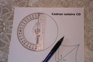Pour lire l'heure solaire il faut aligner le cadran avec l'axe des pôles (C'est Jamy qui vous l'a dit plus haut) Pour cela, il fallait respecter l'angle de 48,7° et il faut encore orienter le cadran avec le Nord.